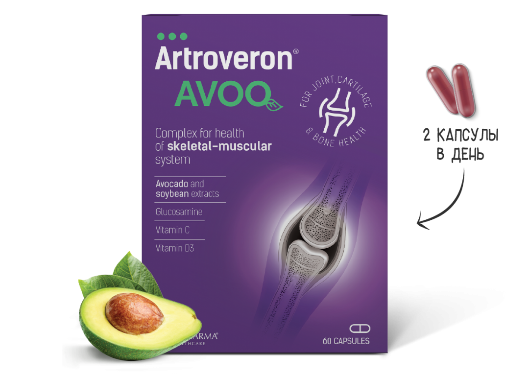 Artroveron® AVOQ наиболее важным ингредиентом являются неомыляемые соединения авокадо и сои (ASU), которые обладают научно доказанным противовоспалительным действием, сравнимым с лекарствами при остеоартрите.