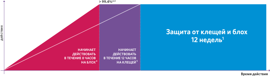 После поступления в организм собаки препарата происходит уничтожение блох в течение 8 часов до момента откладки ими яиц и в течение 12 часов — уничтожение клещей, которые в данный период обитали на животном. Кроме того, медикамент защищает организм от повторного заражения эктопаразитами.
