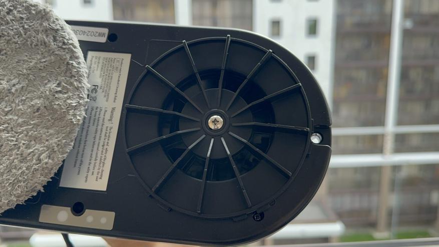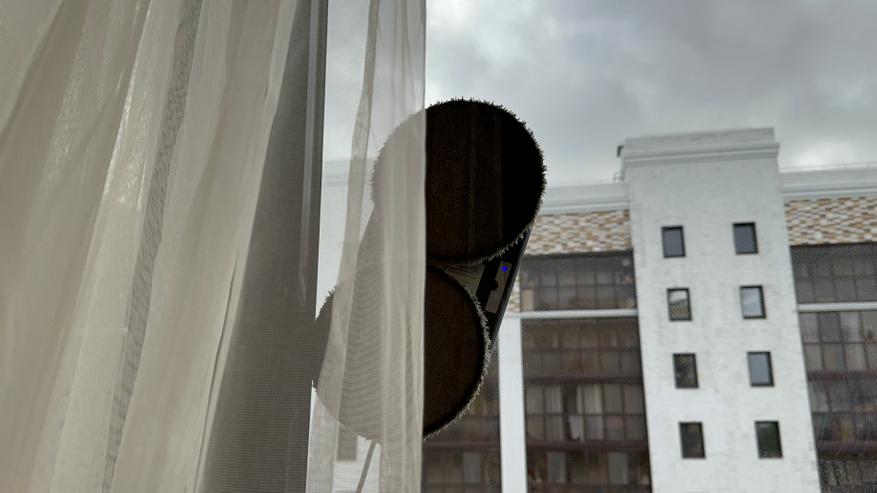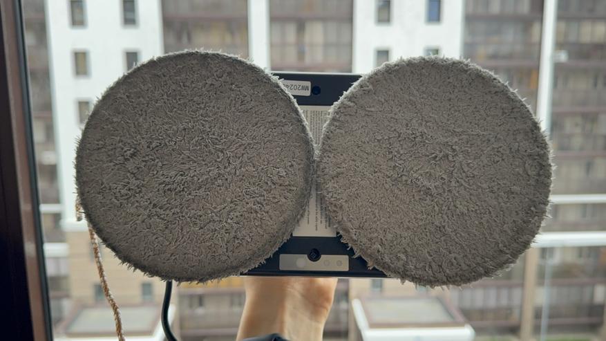 В первую очередь я распылил моющее средство на вращающиеся диски (можно просто воду). После чего прислонил устройству к окну и нажал на кнопку включения. Через небольшой промежуток времени робот крепко прилип к окну, и я еще раз нажал на кнопку включения, после чего девайс приступил к работе. «Прилипает» он к окну благодаря вакууму, который он же и создает. На фото ниже можно заметить, какие окна были грязные до мытья: