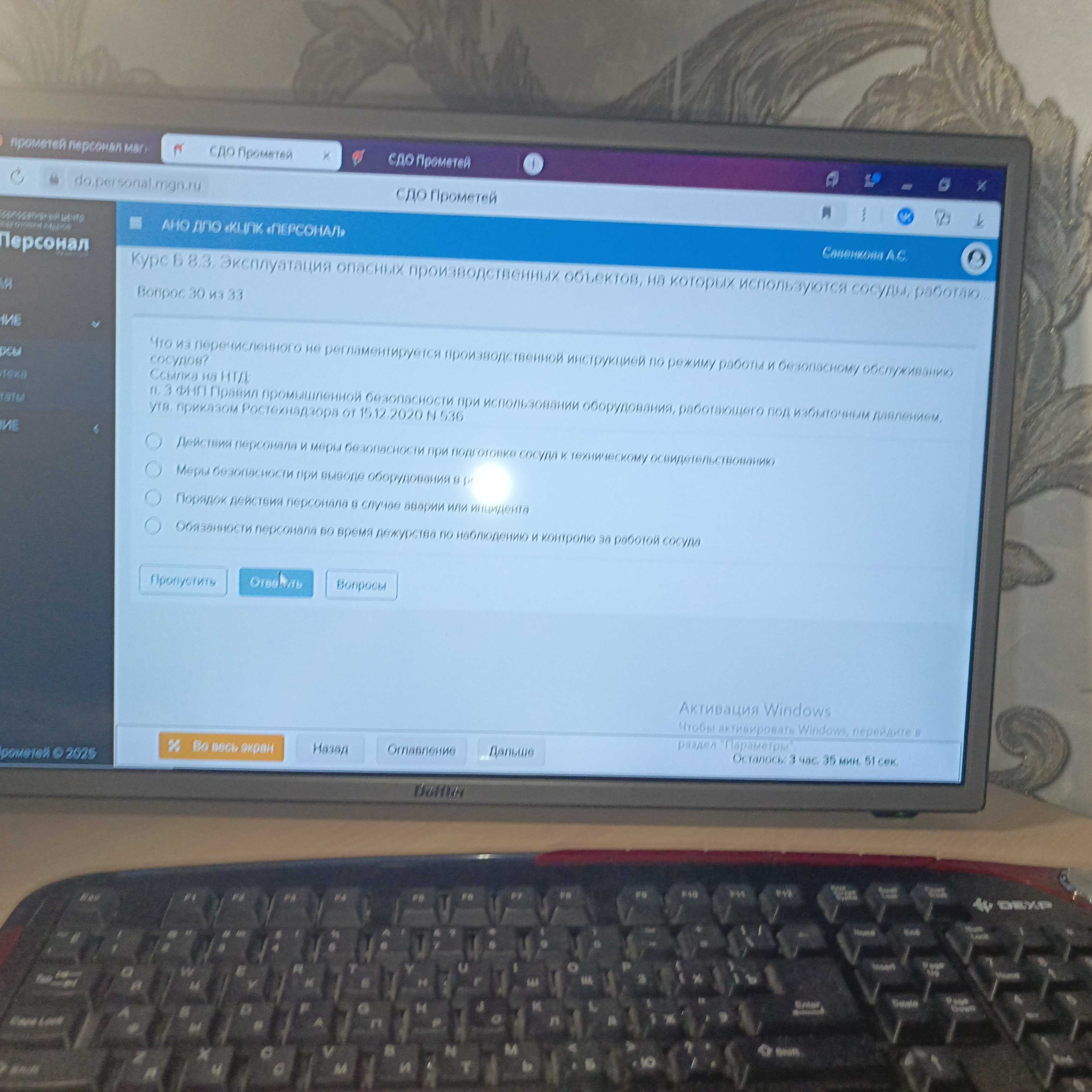 - Действия персонала и меры безопасности при подготовке сосуда к техническому освидетельствованию.Вы ответили верно Правильный ответ Ваш ответ