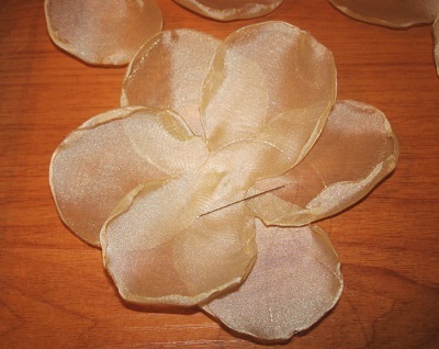 4. Начните собирать лепестки. Используйте для этого нить. Можно прошивать по 3 лепестка. Начните с больших лепестков и потом с лепестков поменьше.