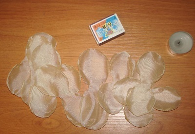 4. Обрежьте концы ткани и опалите их аккуратно над огнем, одновременно скрепляя лепесток.