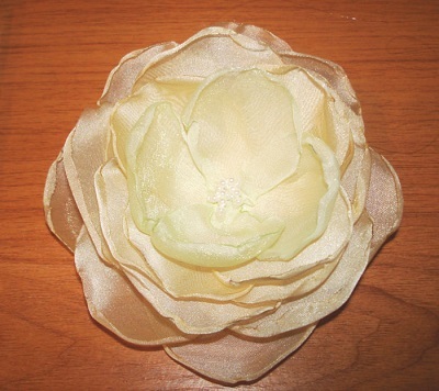 Каждый лепесток закрепляется ниткой с изнанки, уже не насквозь, а за предыдущий слой ленты.
