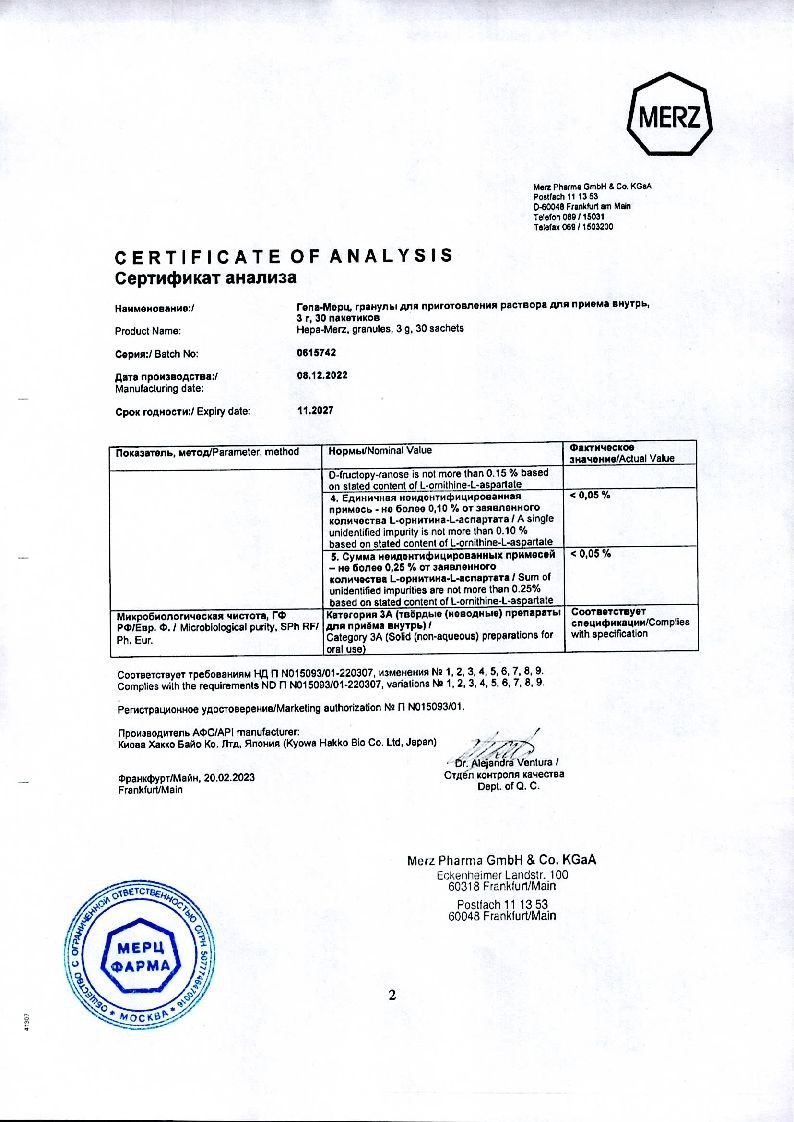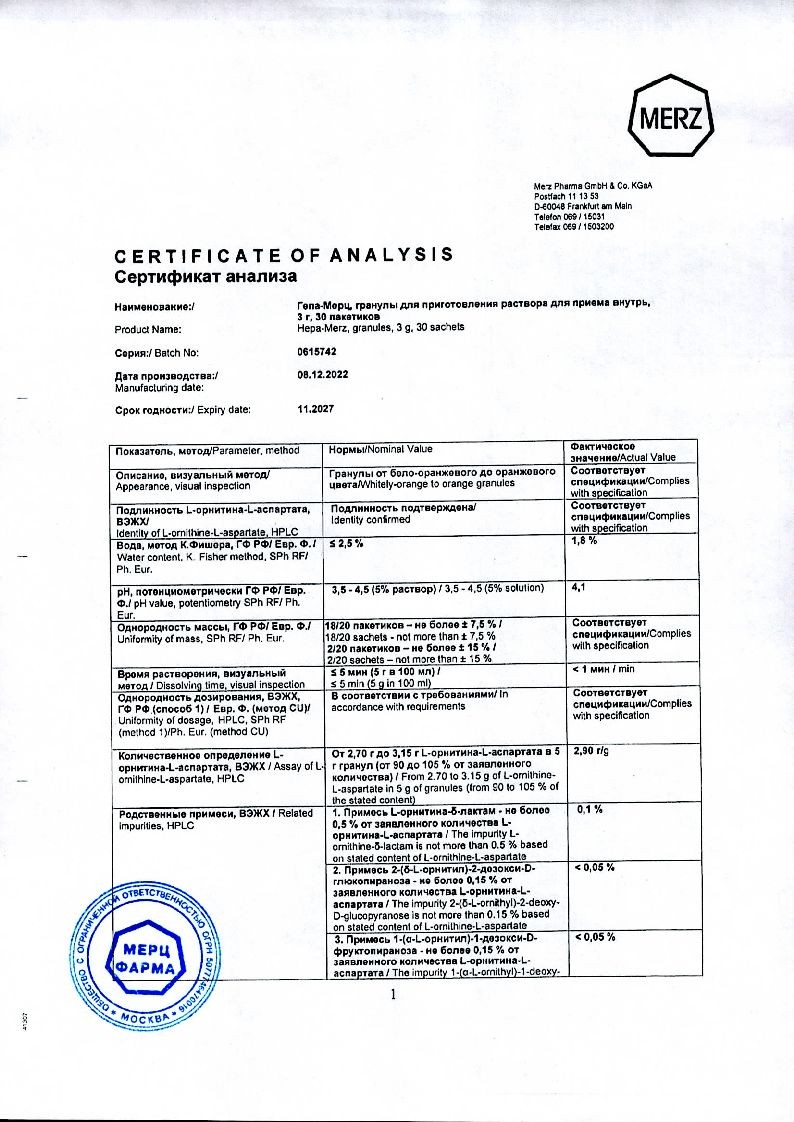 Активное вещество лекарственного средства — орнитина аспартат, включенный в фармако-терапевтическую группу гипоаммониемических препаратов. Помимо него в растворе присутствует только вода для инъекций. В терапевтическую линейку Гепа-Мерц входят также белые и оранжевые гранулы, помещенные в пакетики из ламинированной фольги. После их разведения в воде получается напиток с приятным вкусом и ароматом. Состав этой лекарственной формы представлен такими веществами: