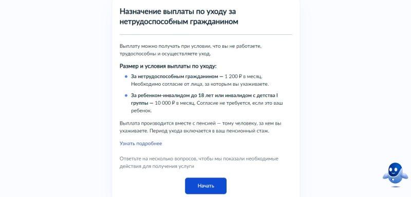 При оформлении ухода за взрослым или ребенком с инвалидностью назначается выплата. Она ежемесячно поступает вместе с пенсией человеку, за которым ухаживают. Заявление на выплату и согласие можно подать онлайн.