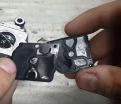 Собираем все обратно и разбираем карбюратор с другой стороны. Открутив 4 болта снимаем крышку, убираем мембрану и оцениваем состояние внутренностей.