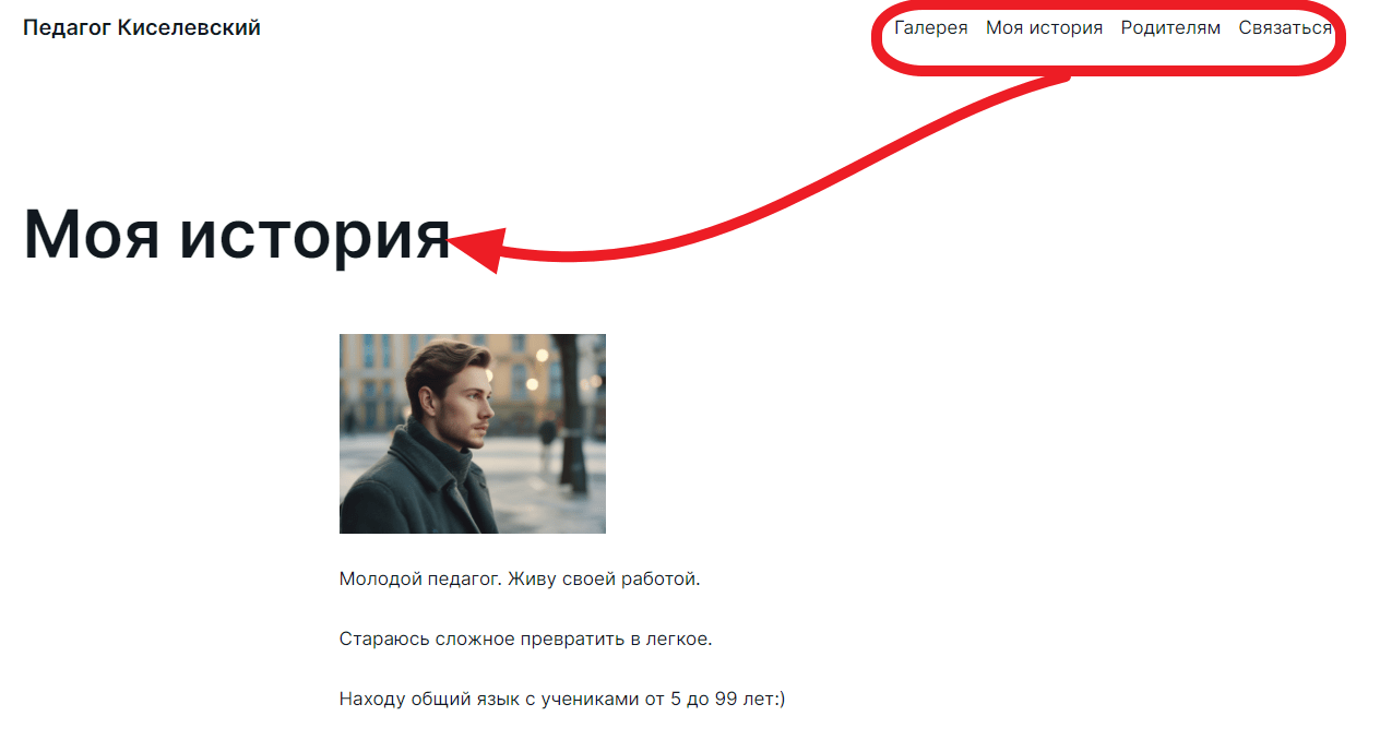 На главной странице можете рассказать немного о себе – чтобы посетитель сразу увидел, что это персональный сайт преподавателя. Достаточно вашей фотографии, краткой информации, а также контактов.