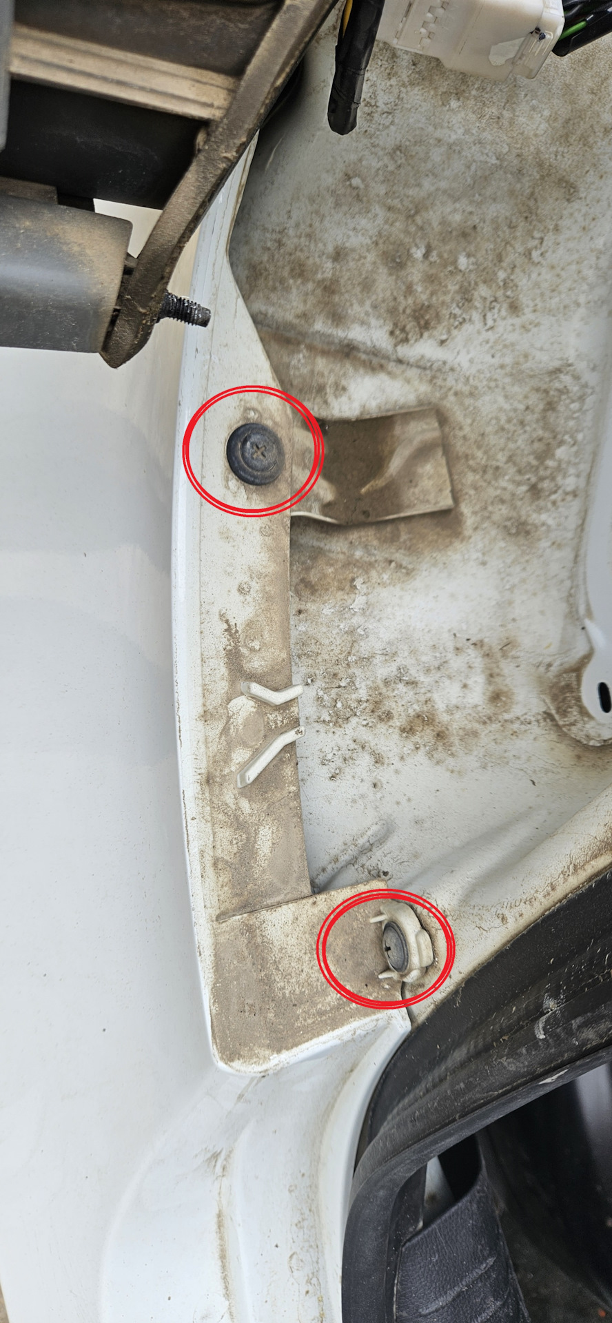 Далее необходимо открутить три гайки от фар для их снятия. Отсоединяем коннектор от фар для их снятия. (У меня честно сказать не получилось коннектор отсоединить). Под ними находиться саморез и клипса, которые держат бампер. (Обшивку с другой стороны ни снимал, так как ее не нужно снимать, а том есть специальное окошко, через которое можно открутить гайки от фар)