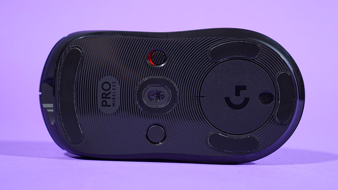 Снизу на мышке Logitech G Pro Wireless тоже многое поменялось. Тумблер для включения оставили без изменений, а вот рядом расположенная кнопка теперь отвечает за переключение dpi, которая раньше всегда располагалась сверху. Вся нижняя часть просто усеяна резными круговыми узорами, и это может отрицательно сказаться на практичности мыши. Примечательно, что в этот раз в комплект не положили 10-граммовый грузик, но для этой мышки он и не нужен. Зато отсек в нижней части теперь вмещает в себя не только модуль PowerCore (который идет в комплекте с ковром Logitech PowerPlay для беспроводной зарядки мыши), но и сделали специальное углубление для радиоконнектора, чтобы мышь можно было спокойно таскать с собой и подключать в любом месте по беспроводной связи. Браво, Logitech! Отменная эргономика, все продумали. Да и сенсор HERO технически чуть ли не самый совершенный сенсор в природе: 400 ips, 40 g; настройка от 100 до 16 000 dpi с шагом настройки 50 dpi.