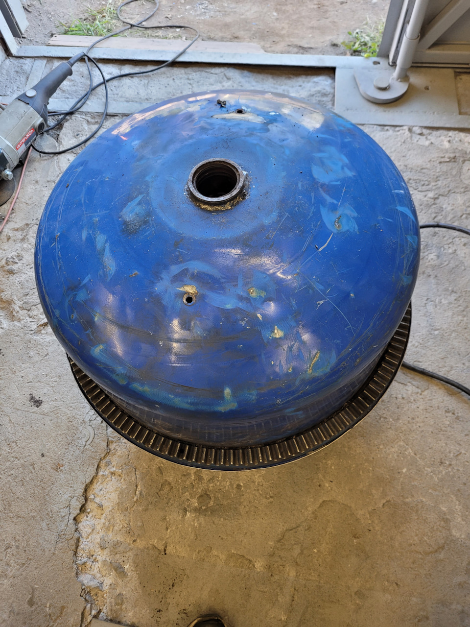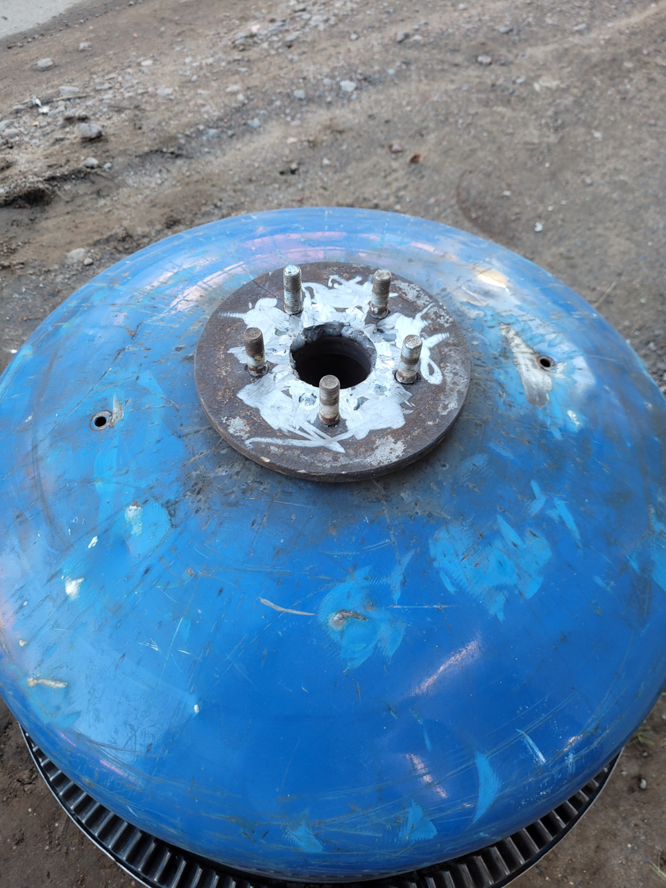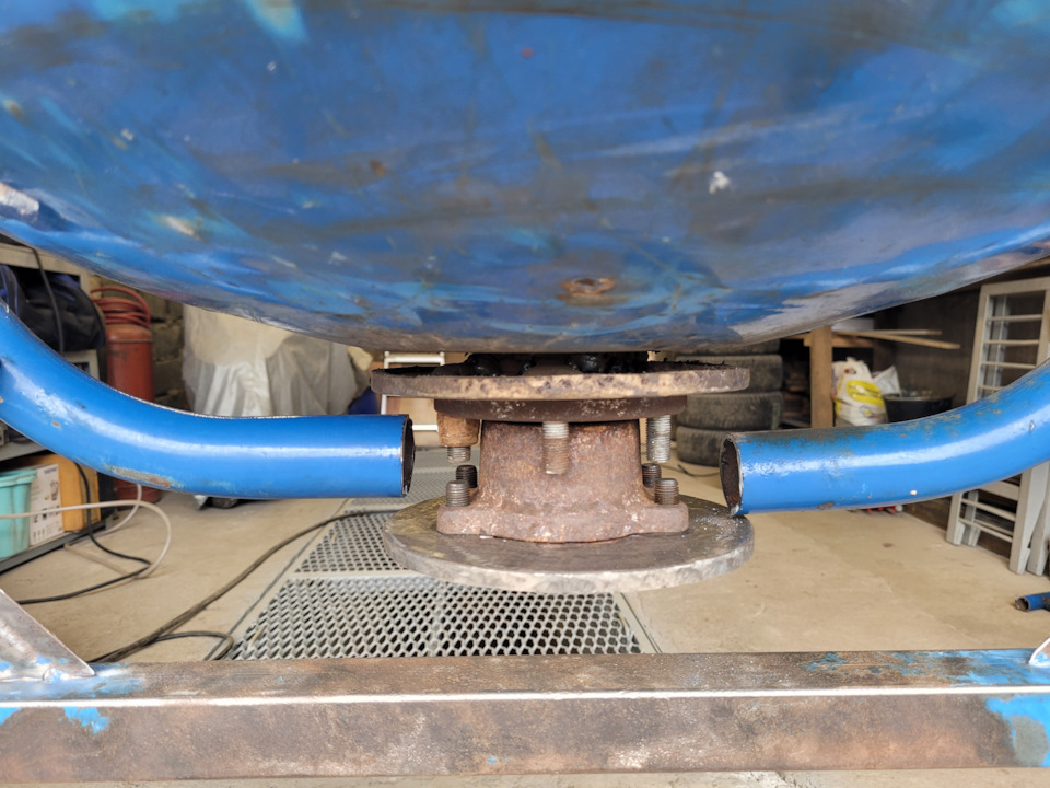 Далее примеряем и центрируем чашу бетономешалки, предварительно установив на нее получившийся новый подшипниковый узел. Кстати прикручивал ступицу на шпильки гайками с косточек (стоек стабилизаторов) Субарика, так же по удивительному совпадению оказавшиеся еще не выброшенными. Подошли один в один. Визуально внешний размер гаек с косточек меньше, чем у обычной гайки, поэтому возможно обычной гайкой закрутить не получится, так как расстояние между шпилькой и ступицей получилось довольно небольшим.