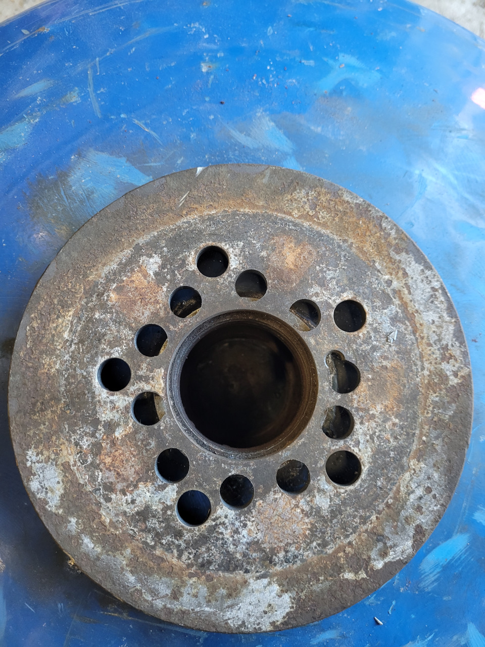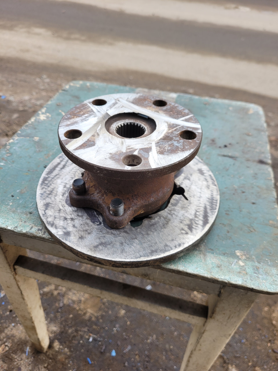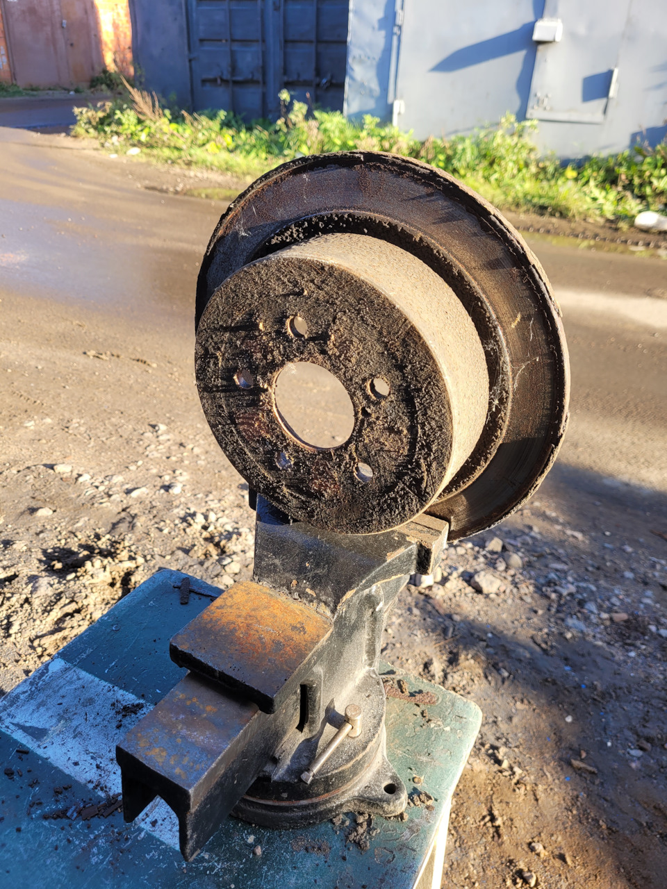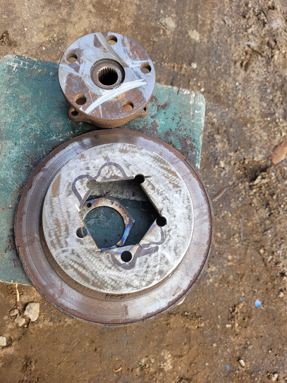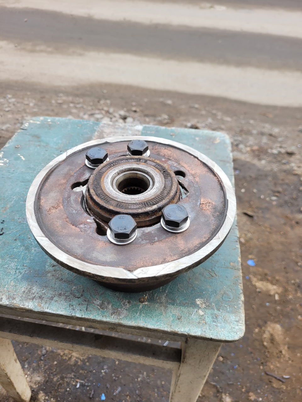 Далее отрезаем торцевую часть диска (как в первом тормозном диске) и устанавливаем на болтовое соединение ступицу, как показано ниже на фото: