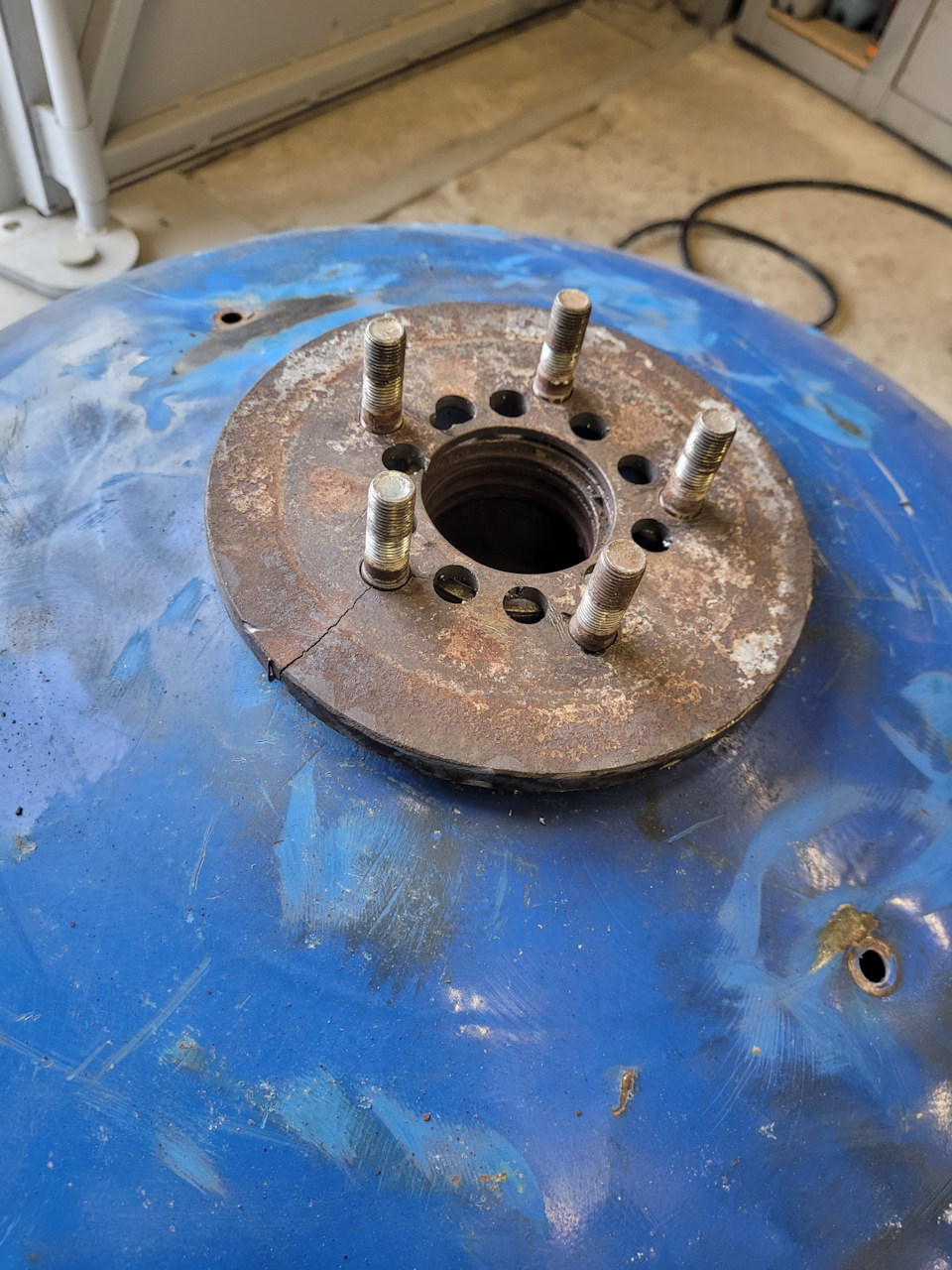 Немного оглядевшись в гараже, в поле моего зрения попались еще не выброшенные в металлолом замененные в своем Субарике ступица и тормозные диски. Думаю в любом гараже будут валяться и не важно какое авто. Было принято решение смонтировать ступицу от моего авто вместо подшипникового узла бетономешалки: обороты в бетономешалке небольшие, выть подшипник в ступице как при движении на машине не будет), нагрузки явно выдержит большие, чем исходный узел, дополнительных затрат 0. Решено, делаем.