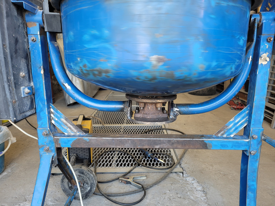 • Ремонт бетономешалки своими руками подразумевает аккуратное отсоединение опоры от емкости. В результате того, что при замешивании различных смесей используется вода, все гайки и крепежные болты, находящиеся извне, часто ржавеют. Поэтому для их откручивания может понадобиться специальный «жидкий ключ» (WD40), который распыляют на болты. Ждем 5-10 минут и пытаемся их открутить. В противном случае все крепежные элементы полностью срезают болгаркой.